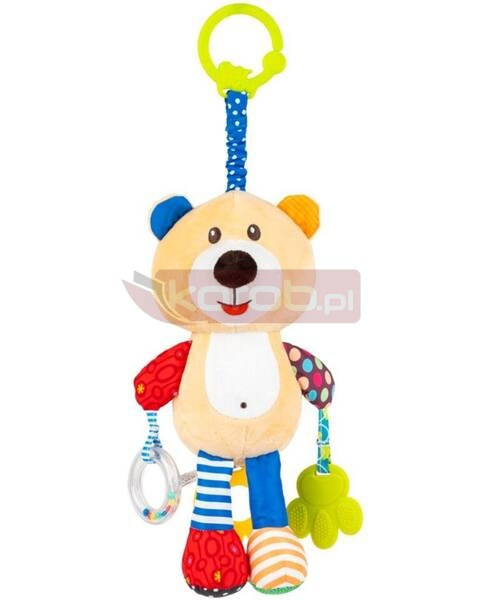 Kolorowy misiek w marynarskich kolorach zabawi malucha na wiele sposobów. Zabawka posiada grzechotkę i dwa miękkie gryzaki, które przyniosą ulgę obolałym dziąsłom ząbkującego bobasa. Jeden z gryzaków kwiatek, doszyty w miejscu misiowego ogonka, uruchamia dodatkowo melodię. Wystarczy go pociągnąć, a miś zagra słodką kołysankę. Nad głową pluszaka znajduje się materiałowa harmonijka, a po lekkim pociągnięciu zabawki, podciągnie się na niej z powrotem, delikatnie podskakując. Misiek został wykonana z materiałów o zróżnicowanych kolorach, wzorach i fakturach, dzięki czemu stymuluje on zmysły malucha, rozwijając przy tym jego zdolności poznawcze.