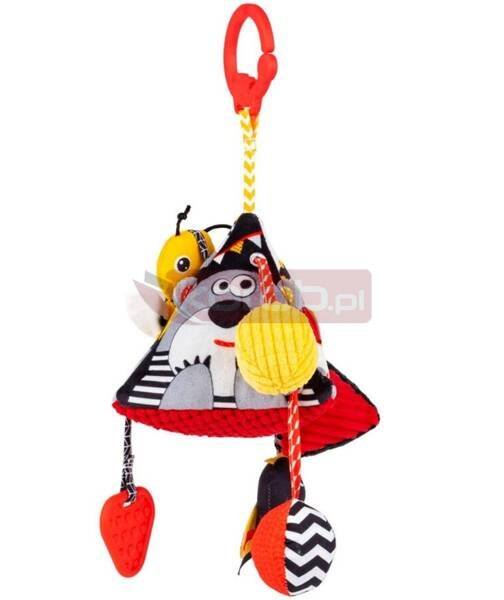 Kontrastowa zawieszka ucieszy oczko i zajmie łapki malucha sensoryczną zabawą! Wśród kryjących się tu niespodzianek, na bobasa czeka bezpieczne lusterko do samopoznania, piszczałka, gryzaczek, który przyniesie ulgę podczas ząbkowania, i tasiemka do przeciągania. Na jednym z jej końców znajduje się urocza pszczółka, która ma tu swój własny domek kieszonkę w kształcie plastra miodu. Zabawka wykonana została z materiałów różniących się wzorem i fakturą, które stymulować będą zmysły malucha, zachęcając go tym samym do sensorycznego odkrywania świata. Praktyczna zawieszka pozwoli zawiesić piramidkę w dowolnym miejscu, aby mogła towarzyszyć bobasowi w każdej sytuacji.
