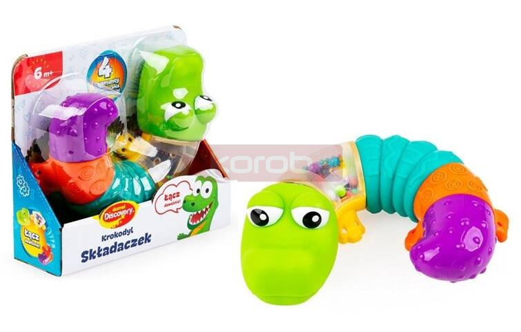 Krokodylek do składania to zabawka, której wygląd można zmieniać, w zależności od tego jak połączymy ze sobą poszczególne segmenty. Zabawka posiada piszczącą głowę, grzechoczące koraliki i obrotowy, terkoczący ogonek. Poszczególne części krokodyla różnią się fakturą i kolorem, co wpływa korzystnie na rozwój zdolności poznawczych dziecka. Zabawka stymulować będzie zmysły malucha, zachęcając go do sensorycznego odkrywania świata.