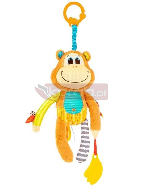 Wesoły małpiszonek rozbawi bobasa, a gdy przyjdzie pora drzemki, zagra do snu uroczą kołysankę. Zabawkę zdobi miękki gryzaczek w kształcie kiści bananów, który z pewnością przyda się każdemu ząbkującemu maluchowi. Małpka uszyta została z materiałów o zróżnicowanych kolorach, wzorach i fakturach, dzięki czemu stymuluje zmysły dziecka, inspirując go do sensorycznego odkrywania świata. Aby uruchomić pozytywkę, wystarczy pociągnąć kółeczka, znajdujące się w miejscu małpiego ogonka. Zabawka wyposażona jest w praktyczną zawieszkę, dzięki której przymocujesz małpkę w dowolnym miejscu, aby wszędzie mogła towarzyszyć dzidziusiowi.