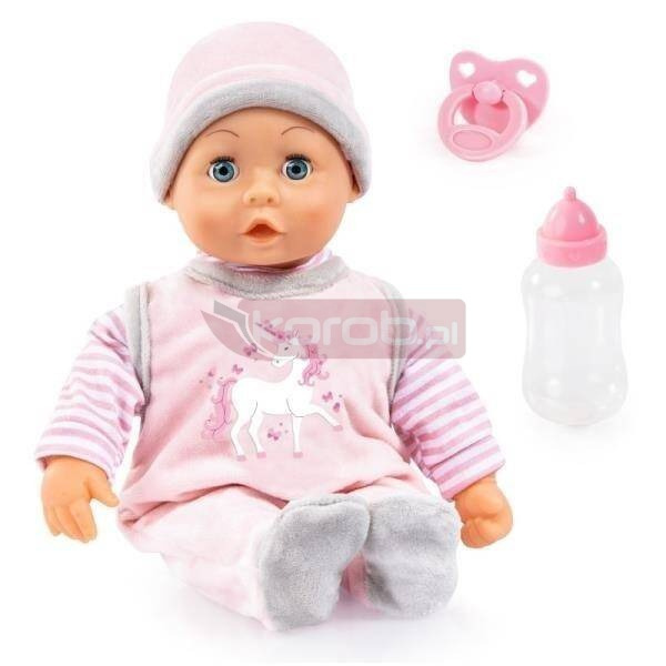 Anna First Words Baby to miękka, 38 centymetrowa lalka z kapturkiem z uszami zajączka. Sprawia wrażenie przymrużonych oczu. Posiada 24 funkcje. Kiedy naciśniesz na jej brzuszek śmieje się, płacze albo wydaje inne dziecięce odgłosy. W zestawie zawarte są: smoczek i butelka. Jest zapakowana w ślicznym pudelku, w którym znajdują się także baterie.