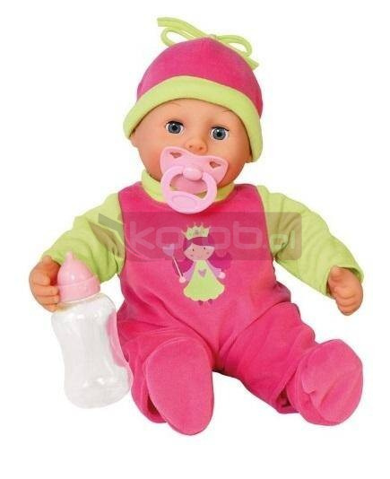 Urocza lalka ma 38 cm wysokości i posiada wiele funkcji. Kiedy naciskasz jej brzuch, śmieje się, płacze lub wydaje inne różne dźwięki dziecka (w sumie 24 dźwięki dziecka) . Lalka ma miękkie ciało i jest idealna do przytulania. W zestawie znajduje się smoczek i butelka do karmienia i pocieszania lalki. Dostarczane w pięknym showboxie, w zestawie baterie są dołączone.
