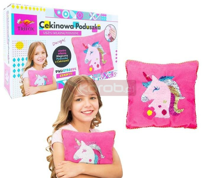 Poduszka do samodzielnego zszycia z obrazkiem jednorożca oraz dwustronnymi cekinami.
