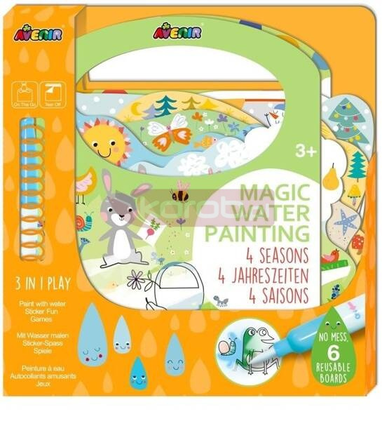 Magiczne wodne kolorowanie - bez bałaganu, gdzie tylko chcesz! Książka zawiera 6 powierzchni do kolorowania (wielokrotnego użytku), naklejki tematyczne oraz długopis na wodę do wielokrotnego napełniania.