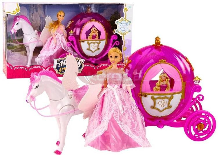 Zestaw lalka księżniczka z karocą i pegazem to niezwykle urokliwy komplet, który przenosi dzieci w magiczny świat bajek i fantazji. Pegaz, będący centralnym elementem zestawu, ma elegancki biały kolor oraz duże, majestatyczne różowe skrzydła, które sprawiają, że wygląda, jakby mógł w każdej chwili unieść się w powietrze. Jego różowa grzywa i uprząż dodają mu uroku i bajkowego charakteru, czyniąc go idealnym towarzyszem dla księżniczki. Karoca, w której księżniczka podróżuje, jest pięknie wykonana w kolorach różowym i białym z dodatkiem złotych elementów. Te harmonijnie dobrane barwy sprawiają, że cała karoca prezentuje się niezwykle stylowo i elegancko. Detale takie jak ozdobne wzory i delikatne wykończenia nadają jej królewskiego charakteru, a koła są solidne i stabilne, co zapewnia płynną jazdę. Lalka księżniczka, będąca sercem tego zestawu, ma długie, lśniące blond włosy, które można czesać i stylizować na różne sposoby. Jej strój to błyszcząca różowo-biała suknia, która mieni się w świetle, dodając jej blasku i splendoru. Ten zestaw wygląda jak wyjęty z prawdziwej bajki i z pewnością zachwyci każde dziecko, które marzy o przygodach w magicznym królestwie. Dzięki detalom i wysokiej jakości wykonaniu, zabawka ta zapewni wiele godzin kreatywnej i radosnej zabawy.