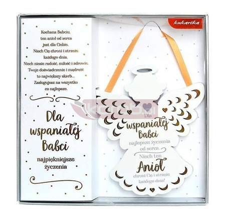 Zawieszka premium w formie Aniołka ZOP-017 to niezapomniany pomysł na prezent. Wykonana z solidnej płyty MDF z wyżłobionymi lustrzanymi zdobieniami oraz napisem w formie krótkiej sentencji. Na tylnej ściance aniołka jest tasiemka do zawieszenia na ścianie. Zawieszka zapakowana jest eleganckie i trwałe pudełeczko z życzeniami w środku, dodatkowo zabezpieczone folią pcv. Cechy szczególne: typ: zawieszka do powieszenia wielkość orientacyjna: wysokość: 14 cm, szerokość: 12,5cm (skrzydła), grubość: 7mm zdobienie: wzory wyżłobione w drewnie z lustrzaną folią, kolorowy napis okazja: Dzień Babci