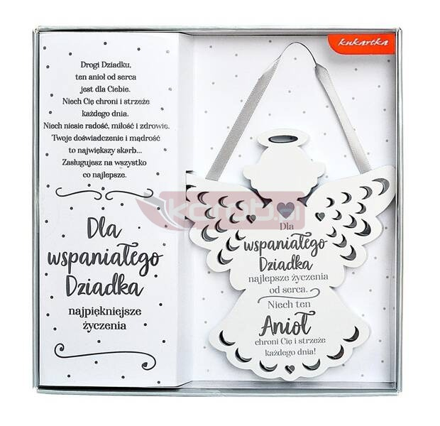 Zawieszka premium w formie Aniołka ZOP-016 to niezapomniany pomysł na prezent. Wykonana z solidnej płyty MDF z wyżłobionymi lustrzanymi zdobieniami oraz napisem w formie krótkiej sentencji. Na tylnej ściance aniołka jest tasiemka do zawieszenia na ścianie. Zawieszka zapakowana jest eleganckie i trwałe pudełeczko z życzeniami w środku, dodatkowo zabezpieczone folią pcv. Cechy szczególne: typ: zawieszka do powieszenia wielkość orientacyjna: wysokość: 14 cm, szerokość: 12,5cm (skrzydła), grubość: 7mm zdobienie: wzory wyżłobione w drewnie z lustrzaną folią, kolorowy napis okazja: Dzień Dziadka