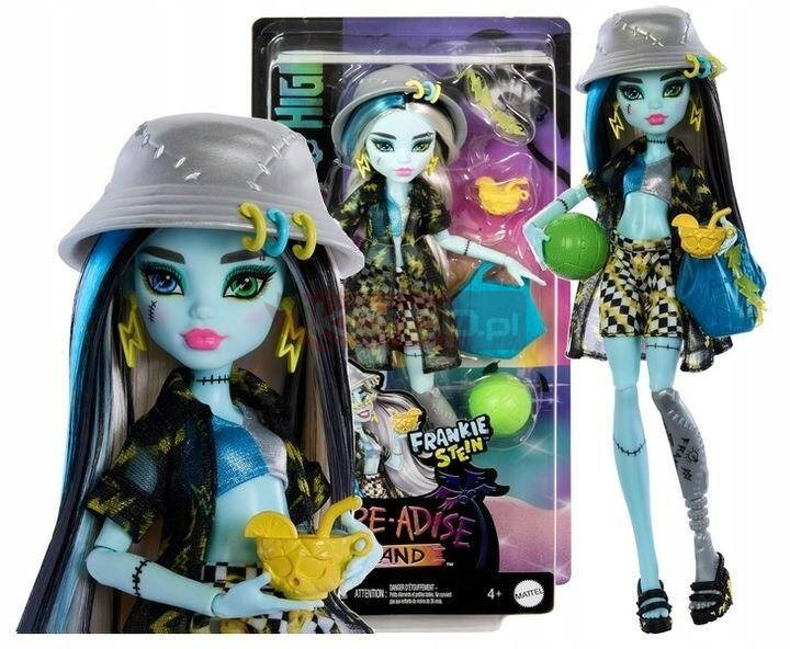 Ta lalka Monster High uwielbia plażowanie! Lalka Frankie Stein nie może się doczekać, by zregenerować siły i naładować baterie na wymarzonych wakacjach. Robiąca piorunujące wrażenie lalka ma odpowiednie ubranka na plażę: top i kraciaste szorty do pływania oraz lekką koszulę plażową chroniącą przed słońcem. W zestawie z Frankie Stein są piłka do siatkówki i „napój”, więc najpierw można rozegrać elektryzujący mecz, a potem sączyć „napój” tak zimny, że aż wywołuje dreszcze! Zabawę wzbogacają takie akcesoria dla lalki jak kapelusz, torba, okulary przeciwsłoneczne z błyskawicami i sandały z paskami. Dzieci mogą zebrać wszystkie lalki Monster High Wyspa Straszy-raj, aby wymyślać opowieści o przyjaźni i potwornie ekscytujące przygody w Trójkącie Bermudzkim. Świetny prezent dla fanów Monster High.