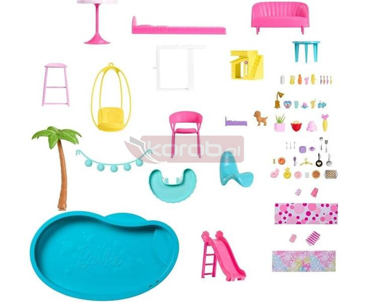 Witamy w wymarzonej willi Barbie, gdzie możliwości inspirują do niekończącej się zabawy. Ta zaktualizowana wersja znanego domku dla lalek oferuje otwarty design, funkcje premium i ponad 75 elementów do opowiadania historii. Dzięki spektakularnej zjeżdżalni spiralnej jako centralnym punkcie Barbie może zorganizować imprezę przy basenie swoich marzeń. To po prostu fajne, jak lalka Barbie i jej goście zjeżdżają ze zjeżdżalni do basenu! Ten domek dla lalek może być również używany jako prawdziwy pałac dla zwierząt domowych, a nawet zawiera figurkę psa. Futrzani przyjaciele będą mieli dużo zabawy z windą dla zwierząt domowych, zjeżdżalnią i basenem, koszem, klapą dla psów i budą dla psów. Od samego początku dzieci mogą godzinami odkrywać dziesięć różnych obszarów zabawy: kuchnię, salon, jadalnię, sypialnię, łazienkę, szafę na ubrania, pokój bonusowy, balkon, basen i najdłuższą zjeżdżalnię. Ponieważ miejsce na cztery lalki wystarcza, impreza przy basenie może stać się imprezą nocną. Konsola w salonie stanie się doskonałym miejscem na nocną imprezę z gwiazdkami i dodatkowym łóżkiem dla dwóch lalek. Dzięki wbudowanym lampom i dźwiękom w kuchni i łazience, zabawnym meblom w tym dodatkowym wysuwanym łóżku w sypialni i balkonowi z palmą na najwyższym piętrze spełnią się marzenia. Dzięki ponad 75 częściom do opowiadania historii można odtwarzać szczegółowe sceny; na przykład funkcjonalna winda, którą można używać również na wózku inwalidzkim, piękna huśtawka, bajeczna szafa na ubrania i wiele innych. Zestaw nie zawiera lalek.