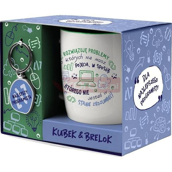 Zestaw prezentowy dla Programisty - idealny na awans, urodziny czy inne okazje. Składa się z kubka (330 ml) i breloka z napisem "Najlepszego Programisty", zapakowanych w eleganckie pudełko. Kubek wykonany z ceramiki, bezpieczny do mycia w zmywarce. Brelok w srebrno-zielonym kolorze to świetny dodatek do kluczy czy portfela. Specyfikacja kubka: Napis: "Najlepszego Programisty" Materiał: ceramika Pojemność: 330 ml Można myć w zmywarce Specyfikacja breloka: Napis: "Najlepszego Programisty" Materiał: metal Średnica: 45 mm Prezent gotowy do wręczenia!
