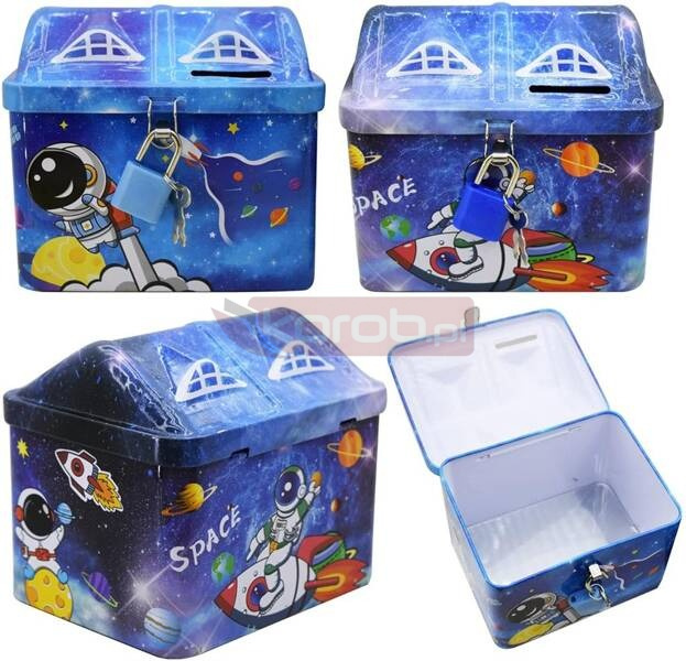 Metalowa, lakierowana skarbonka z motywem kosmosu dostępna w 4 wzorach. Idealny pomysł na prezent, który uczy oszczędności i sprawia, że pieniądze są bezpieczne dzięki kłódce zamykanej na kluczyk.