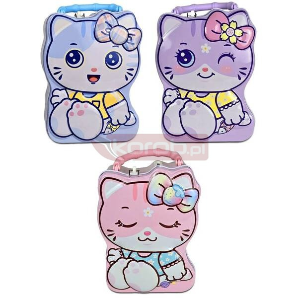 Metalowa, lakierowana skarbonka z motywem kotka dostępna w trzech kolorach. Idealny pomysł na prezent, który uczy oszczędności i sprawia, że pieniądze są bezpieczne dzięki kłódce zamykanej na kluczyk.