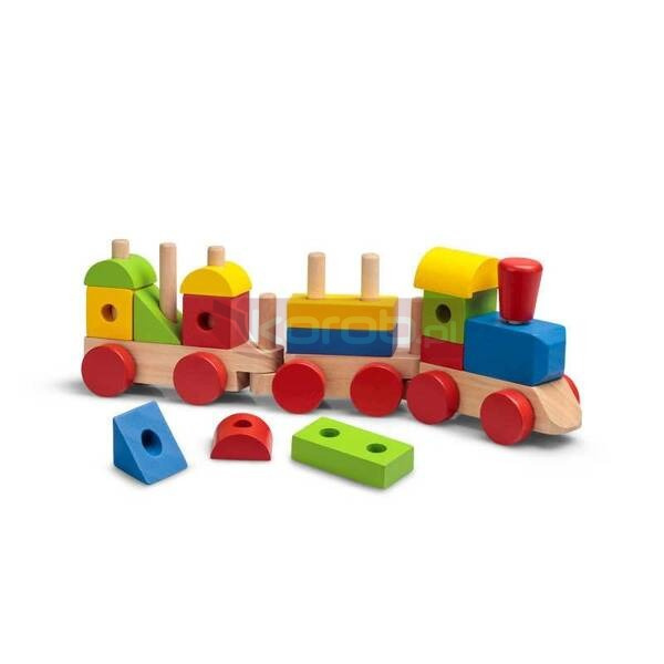 Klasyczna drewniana układanka w ciekawej wersji pociągu z dźwiękami. Zestaw zawiera lokomotywę i dwa wagony z kołkami oraz różne kolorowe elementy do układania. Naciśnij lej na lokomotywie, aby odtwarzać dźwięk. Odtwarza trzy różne dźwięki pociągu.