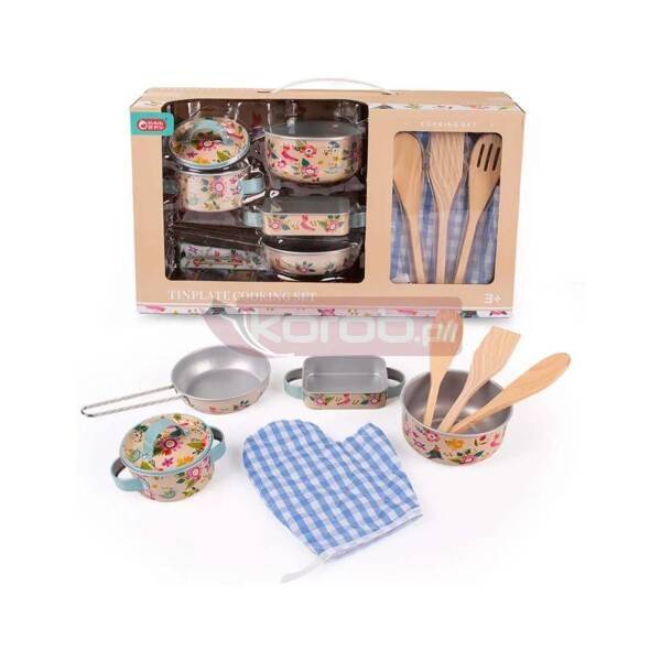 Kompletny zestaw metalowych naczyń, zaprojektowany z myślą o małych kucharzach zawiera dwa garnki, patelnię, pokrywkę, naczynie prostokątne oraz niezbędne akcesoria kuchenne jak łyżki i szpatułki. Dodatkowo, w zestawie znajduje się także rękawica kuchenna, która uzupełnia kuchenny arsenał każdego małego szefa kuchni.