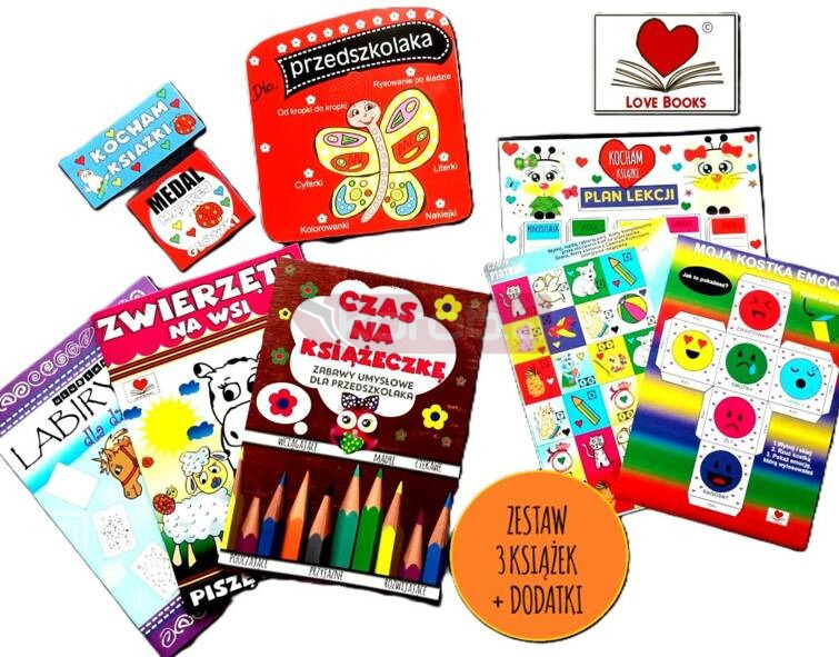 DLA PRZEDSZKOLAKA ZESTAW 3 KSIĄŻEK Z DODATKAMI Super zestaw 3 książek dla dzieci w wieku przedszkolnym. W zestawie następujące książki: ULUBIONE LABIRYNTY DLA DZIECI ZWIERZĘTA NA WSI. TO LUBIĘ! CZAS NA KSIĄŻECZKĘ. ZABAWY UMYSŁOWE DLA PRZEDSZKOLAKA W zestawie dodatkowo znajdują się naklejki, gra Piotruś do wycinania i zabawy, Wycinanka- kostka emocji, plan lekcji i zabawy. Zestaw zapakowany w foliowy worek.