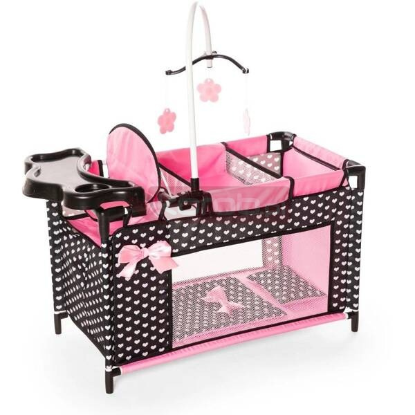 Lóżko dla lalek oferuje niezliczone możliwości zabawy. W zintegrowanym wysokim krzesełku można wygodnie karmić lalki dzięki tacy jadalnej. Do przechowywania akcesoriów lalki lóżko zawiera przegródkę, która można łatwo zamknąć i otworzyć dzięki zapięciu na rzepy. Dzięki dołączonym do zestawu wieszakom (3 sztuki) ubranka lalki można powiesić. Dodatkowo za siedziskiem przewidziano miejsce do przewijania lalki. Dzięki mobilowi lalka jest zawsze zabawiana podczas przewijania. Dołączona do zestawu poduszka i kocyk zapewniają lalce przytulny sen.