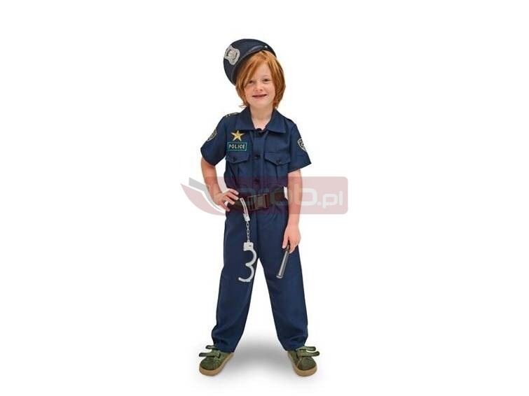 Strój Policjant, dziecięcy, rozmiar 96-116 cm (3-6 lat). Strój w kolorze granatowym ze złotymi naszywkami. Zestaw zawiera czapkę, koszulę zapinaną na guziki, spodnie, regulowany pas, kajdanki oraz radio. Skład: 100% poliester. Wymiary produktu: czapka: obwód 53 cm, koszula: wysokość 49 cm, szerokość pod pachami 40 cm, obwód kołnierzyka 38 cm, spodnie: długość 65 cm, pas: 5x 60-103 cm, kajdanki: 27,5 x 7,4 cm, radio: 13,4x5 cm