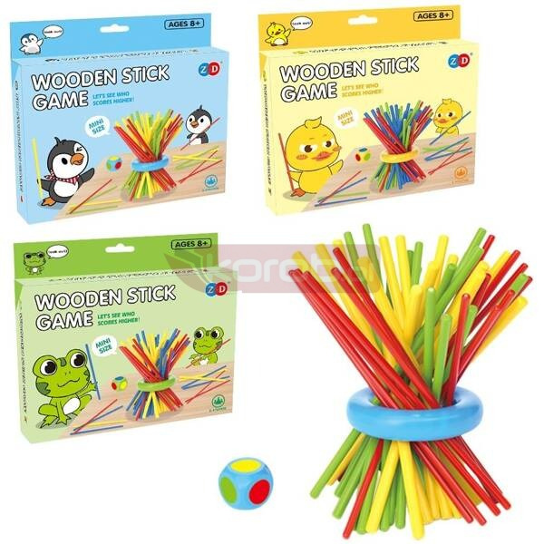 "Gra patyczki to wspaniała zabawa dla całej rodziny. W otworze umieszcza się patyki i wyciąga je kolejno zgodnie z kolorami, wyrzuconymi na kostce, uważając jednak, aby dysk nie dotknął stołu. Celem gry jest wyciągnięcie jak największej liczby patyczków, zanim dysk opadnie. Gracz, który doprowadzi do jego upadku - przegrywa."