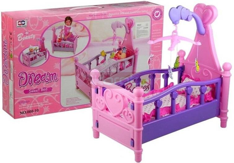 Duże łóżeczko dla lalki z karuzelą i pościelą Spraw, by Twoje dziecko już od najmłodszych lat uczyło się delikatności i troski wobec swych najbliższych. Zabawa z wykorzystaniem prezentowanego łóżeczka z pewnością sprawi, że każda dziewczynka lubiąca zabawę w dom poczuje się jak opiekuńcza mamusia. Urocze łóżeczko w zestawie z ciekawym wyposażeniem będzie doskonałym urozmaiceniem każdej zabawy, a ponadto rewelacyjnie będzie się prezentować w każdym dziecięcym pokoju. Wzornictwo zabawkowego łóżeczka aż do złudzenia przypomina pełnowymiarowe łózko dla malucha. Różowo-fioletowe elementy posiadają przepiękne dodatki, takie jak żłobione ornamenty czy serduszka na barierkach. Połączenie konstrukcji z obrotową karuzelką było świetnym pomysłem! Od teraz każda lala zaśnie w mgnieniu oka, a zwisające nad nią kolorowe żabki odpędzą wszelkie koszmary. Zestaw składa się z: - łóżeczka, - karuzeli z zabawkami, - poduszki, - kołderki. Łóżeczko jest bardzo proste w montażu, jednak odznacza się solidnością i trwałością. Jesteśmy przekonani, że swą cukierkową kolorystyką zwróci uwagę każdej małej dziewczynki, która uwielbia wcielać się w rolę mamusi. Podczas kompletowania zestawu nie pominięto najważniejszego elementu - cieplutkiej kołderki i mięciutkiej poduszki, rewelacyjnie komponujących się z łóżeczkiem. Wymiary łóżeczka: 48 cm x 28 cm. Wymiary opakowania: 50 cm x 30 cm x 10 cm Łóżeczko wykonane jest z solidnego, atestowanego tworzywa, jakim jest plastik. Jego konstrukcja jest pozbawiona ostrych zakończeń, dzięki czemu jest bardzo bezpieczna w użytkowaniu. Dołączona do zestawu pościel jest bardzo miękka i przyjemna w dotyku, wymiarem dopasowana jest do łóżeczka. Zestaw zapakowany jest w urocze, różowe pudełko, dzięki czemu rewelacyjnie nadaje się na prezent. Produkcja zabawki jest zgodna z normą EN 71, przeznaczona jest dla wszystkich dziewczynek powyżej 3. roku życia.