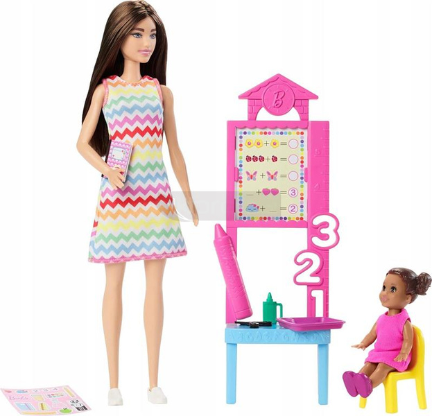 Szykuj się do nauki z lalką Barbie Nauczycielką! Zestaw zawiera lalkę Barbie, uroczą małą uczennicę oraz akcesoria potrzebne w klasie. Barbie ma pod opieką małą uczennicę oraz tablicę edukacyjną! W zestawie są też naklejki, które możesz przykleić na tablicy, oraz ciekawe elementy do wymyślania szkolnych opowieści. Wśród akcesoriów potrzebnych w klasie są m.in. „bezpieczne nożyczki”, zeszyt i krzesło dla uczennicy. Z lalką Barbie inspirującą do marzeń, dzieci mogą odkrywać świat pełen niezwykłych opowieści i ścieżek kariery.