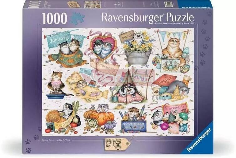 Od stycznia do grudnia będziesz świadkiem przezabawnych eskapad tych uroczych kulek futrzanych, przeżywających wzloty i upadki kociego życia, dzięki tej 1000-elementowej układance. Niezależnie od tego, czy powodują chaos fajerwerkami, drzemią na zalanej słońcem plaży, czy psują kłębki włóczki, te kapryśne kotki z pewnością wywołają uśmiech na Twojej twarzy dzięki swojej nieograniczonej energii i niepohamowanemu urokowi. Zbierz więc swoich ulubionych miłośników kotów, zwolnij miejsce na stole i przygotuj się na wyruszenie w mrucząco zachwycającą przygodę przez świat, w którym każdy dzień jest kocim świętem!
