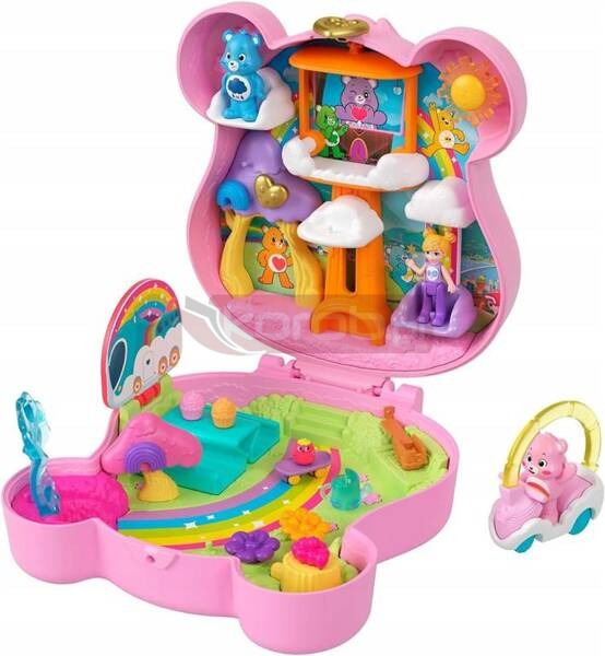 Troskliwe Misie odkrywają mały świat wielkich przygód wraz z Polly Pocket! Zestaw kompaktowy w kształcie Troskliwego Misia mrugającego oczkiem po otwarciu odsłania Krainę Troskliwości, w której królują słońce, tęcze i nieustająca radość. Dzieci czeka tu mnóstwo zabawy z mikrolalką Polly, dwoma figurkami misiów i akcesoriami tematycznymi, takimi jak kultowy pojazd-chmurka. Polly uwielbia widok z wygodnego chmurkowego fotela! Troskliwe Misie mogą wybrać się na piknik w parku albo po kolei wjeżdżać windą do domku na drzewie, aby wraz z Polly „bujać w obłokach”. Ten zestaw kompaktowy to doskonały prezent dla fanów Polly Pocket i Troskliwych Misiów od 4 roku życia.