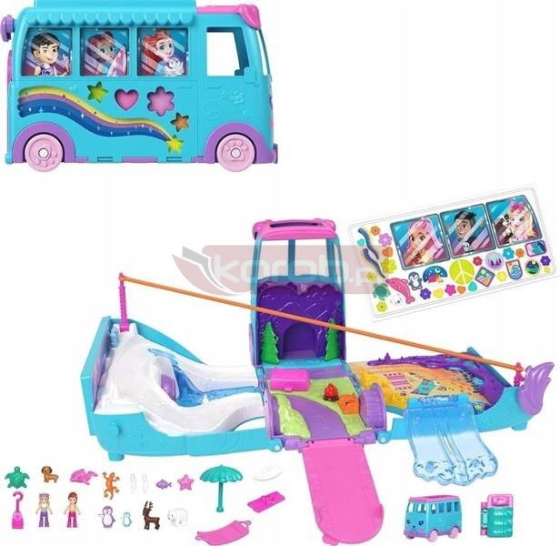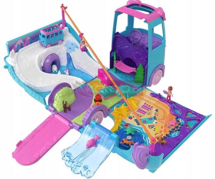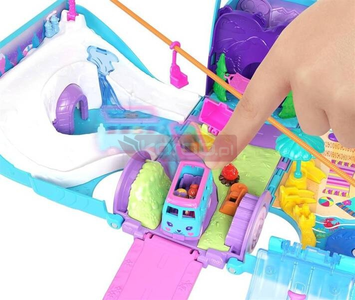 Dołącz do Polly Pocket i jej przyjaciół na wycieczce, na którą wyruszycie z zestawem Podróżny Van Mega przygoda! Udekoruj kamper uroczymi naklejkami, a potem otwórz go, by przekształcić w zestaw z wyjątkowymi funkcjami i miejscami do zabawy, takimi jak wyciąg narciarski i fale do surfingu! To niezapomniana przygoda z motywem natury oraz dwoma mikrolalkami i 21 akcesoriami, takimi jak zwierzątka i mniejsze autko do poruszania się po zestawie – idealne do odkrycia wszystkich zakamarków! Inne mikropojazdy Polly Pocket są także kompatybilne z tym zestawem (sprzedawane oddzielnie). Po całym dniu na nartach posiedź w igloo z misiem polarnym lub daj się ponieść fali wraz z różowym delfinkiem. W tym zestawie czeka tak wiele zabawy! Złóż zestaw z powrotem w pojazd, aby zabrać zabawę ze sobą, gdzie tylko chcesz.