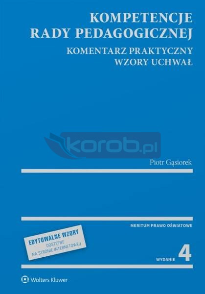 Publikacja w sposób kompleksowy przedstawia kompetencje rady pedagogicznej publicznego przedszkola, szkoły i placówki wynikające z powszechnie obowiązujących przepisów prawa - ustaw i rozporządzeń, w tym związanych z kształceniem na odległość, a także ramowych planów nauczania dla publicznych szkół. Autor szczegółowo omawia: kompetencje stanowiące, opinie oraz wystąpienia rady pedagogicznej o opinie i zgody, a także porozumienia, zgody i wnioski. Dla każdej kompetencji została wskazana podstawa prawna oraz informacja, w jakim typie jednostki oświatowej jest wykonywana. Opisy uzupełniono przykładami uchwał rady pedagogicznej podjętymi w zakresie każdej z nich. W najnowszym wydaniu zmodyfikowano istniejące i dodano nowe kompetencje, przykłady i wzory uchwał rady pedagogicznej, w tym wzór regulaminu działalności rady pedagogicznej. Wzory zostały sporządzone zgodnie z zasadami techniki prawodawczej, zatem zawierają odniesienie do wszystkich Dzienników Ustaw publikujących zmiany aktów prawnych, na podstawie których są przyjmowane uchwały.