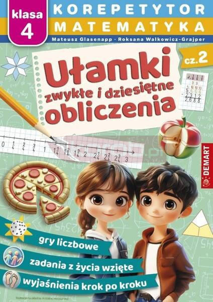 2 część serii Korepetytor. Matematyka. Klasa 4. To pomoc w nauce domowej, która: zawiera wyjaśnienia czym są ułamek zwykły oraz liczba mieszana, jak je porównać i zapisać w najprostszej postaci; zawiera wyjaśnienia czym jest ułamek dziesiętny, liczba mieszana oraz jak je porównać; instruuje w zakresie przedstawiania ułamków (zwykłych i dziesiętnych) na osi liczbowej; przybliża działania na ułamkach zwykłych i dziesiętnych; zawiera podstawowe informacje przypominające pozostałe zagadnienia matematyczne: o działaniach (w pamięci i pisemnych), ich kolejności oraz o jednostkach. Publikacja przeznaczona jest dla uczniów klasy IV, którzy potrzebują więcej treningu, by zgłębić podane zagadnienia matematyczne. Pozostałe znajdują się w dwóch innych częściach tej serii. Tłumaczenie odbywa się na przykładach rozpracowanych "krok po kroku". Zadania "z życia wzięte", pokazują, że zdobywana wiedza jest po prostu przydatna. Polecenia w formie gier wprowadzają element zabawy i rywalizacji. Do ksiązki dodane są specjalnie opracowane pomoce: ramki do tworzenia i odczytywania ułamków dziesiętnych i liczb mieszanych z częścią dziesiętną, zestawy cyfr i znaków matematycznych do proponowanych gir i zabaw, osie liczbowe oraz ułamki kolorowe "kołowe" i w formie prostokątów.