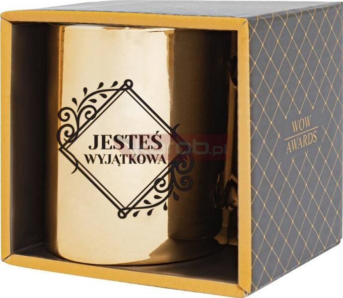 Personalizowany kubek prezentowy z napisem Jesteś Wyjątkowa - idealny upominek dla bliskiej osoby Odkryj wyjątkowy sposób, aby wyrazić swoje uczucia - z naszym personalizowanym kubkiem prezentowym "Jesteś Wyjątkowa". Idealny dla każdej ważnej i wyjątkowej osoby Twoim życiu, bez względu na okazję. Świetnie sprawdzi się jako upominek na szereg okazji dla Niej i dla Niego. Wygląd kubka Ten elegancki złoty kubek urzeka swoją elegancką, stylową kolorystyką i modnym designem. Złoty odcień, wzbogacony czarnym napisem, nadaje mu wyrafinowany charakter. Unikalny napis "Jesteś Wyjątkowa" wygrawerowany na kubku, dodaje osobistego akcentu. Specyfikacja: Materiał: Wysokiej jakości ceramika i porcelana Pojemność: 350 ml Opakowanie: Eleganckie kartonowe pudełko prezentowe Uwagi: Zabronione jest mycie w zmywarce