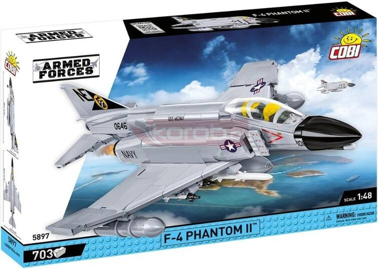 COBI-5897 F-4 Phantom II ARMED FORCES 703 klocki 0 figurek Grupa wiekowa 8+ Skala 1:48 F-4 Phantom II to naddźwiękowy myśliwiec wielozadaniowy, służący w amerykańskim lotnictwie od lat 60. Zaprojektowany przez McDonnell Aircraft, był wykorzystywany w misjach przechwytujących, bombowych i rozpoznawczych, podczas wojny w Wietnamie. Osiągał prędkość ponad Mach 2 i przenosił szeroki wachlarz uzbrojenia. Na lotniskowcu-muzeum USS Midway w San Diego Phantom II jest jednym z kluczowych eksponatów. Zwiedzający mogą zobaczyć go z bliska, poznając jego rolę w historii lotnictwa wojskowego. Z 703 klocków konstrukcyjnych COBI zbudujesz kultowy samolot F-4 Phantom II w jednostki z lotniskowca USS Midway, który można zwiedzać w San Diego (USA). Licencyjny zestaw został zbudowany na podstawie planów samolotu F-4 przy zachowaniu najwyższej dbałością o klockowe detale. Samolot posiada charakterystyczne nadruki, ruchome lotki oraz odpinane podwozie i uzbrojenie. Kabina jest otwierana i można w niej umieścić symboliczne mini figurki pilotów. W komplecie znajduje się klockowa podstawka ekspozycyjna oraz tabliczka zawierająca nazwę, skalę samolotu. Model w skali 1:48 uzupełnia serię samolotów wydanych w ramach kolekcji Armed Forces! Zbuduj to! 703 wysokiej jakości elementy, wyprodukowane w UE przez firmę z ponad 35-letnią tradycją, spełniają normy bezpieczeństwa dotyczące produktów dla dzieci, w pełni kompatybilne z innymi markami klocków konstrukcyjnych, klocki z nadrukami nie odkształcają się i nie bledną w czasie zabawy czy pod wpływem temperatury, czytelna i intuicyjna instrukcja oparta na rysunkach i ikonach, 100% nadruków, żadnych naklejek, klockowa podstawka pod samolot, tabliczka z nazwą zestawu, Wymiary modelu (dł x szer x wys): 380 mm (14.96") x 240 mm (9.45) 120 mm (4.72)