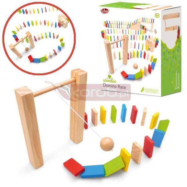 To kompletny zestaw pozwalający budować tory z domina o przeróżnych kształtach, które później należy przewracać. Opakowanie, to zestaw 200 kostek domina, w przeróżnych kolorach, które wykonane zostały z drewna. W zestawie znajdują się także elementy urozmaicające budowanie toru, takie jak mostek, schody dla domina czy obrotowe koło dla kostek. Tak bogaty zestaw daje wręcz nieograniczone możliowści tworzenia torów, a kupno kilku zestawów znacząco zwiększa warianty konstrukcyjne. Estetyczne pudełko o szerokości 24cm pozwala na przechowywanie wszystkich elementów wchodzących w skład zestawu.