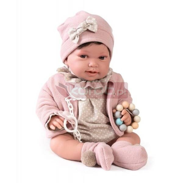 Zależy Ci na tym, aby lalka dla dziewczynki była ubrana w piękne, stylowe i miłe w dotyku, ręcznie szyte ubranka? Recien Nacida Pipa urzeka modnym i gustownym strojem. Jasnobeżowe, bawełniane body w białe groszki jest wykończone ozdobnymi mankietami i kołnierzykiem z falbanką. Ciepły sweterek oraz czapeczka udekorowana kokardką zostały wykonane z wysokiej jakości dzianiny w kolorze pudrowego różu. Wygodne skarpetki z pluszowymi pomponami doskonale dopełniają zachwycający strój. Dodatkowo w komplecie znajdują się idealnie dopasowane akcesoria: smoczek na łańcuszku z klipsem w kształcie uroczego misia oraz gryzak w formie dziewczęcej bransoletki w pastelowych kolorach. Każdy element outfitu został zaprojektowany z największą dbałością o detale, co podkreśla najwyższą jakość i wyjątkowość zabawki.