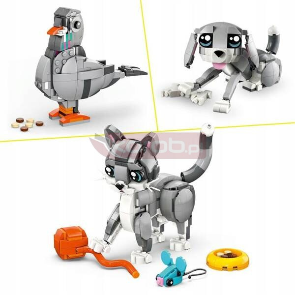 Dzieci mogą zbudować trzy różne zwierzątka z tych samych klocków: ruchomego kota, który może siedzieć, stać i skakać, ruchomego psa z kością oraz gołębia z okruchami chleba. Wszystkie trzy sceny sprawiają, że jest to świetny prezent LEGO dla dzieci.