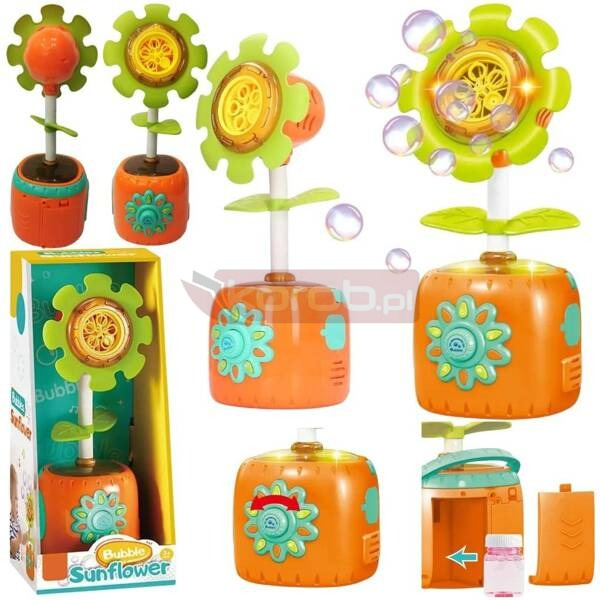 Melodie wydobywające się ze słonecznika są dodatkową atrakcją i umilają dziecięcą zabawę. Poruszający się kwiat ukierunkuje ruch baniek, a bańki szybko się rozprzestrzenią wokół.