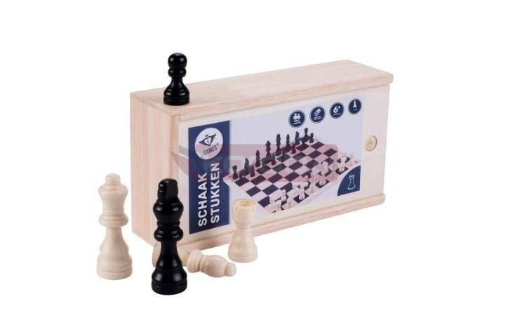 32 figury szachowe w pudełku z drewna jesionowego. Figury szachowe są czarne i mają naturalny kolor. Wysokość króla: 77 mm. Zestaw nie zawiera planszy