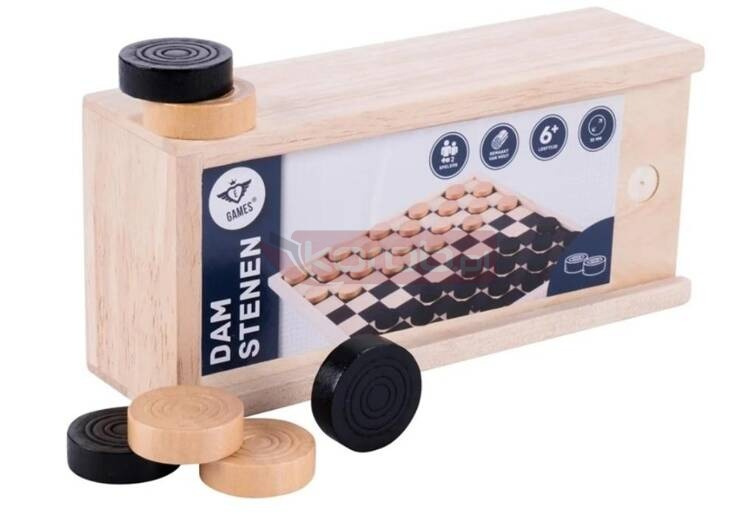 Warcaby czarne/naturalne drewno jesionowe 30 mm w drewnianej skrzyni z przesuwaną pokrywą.
