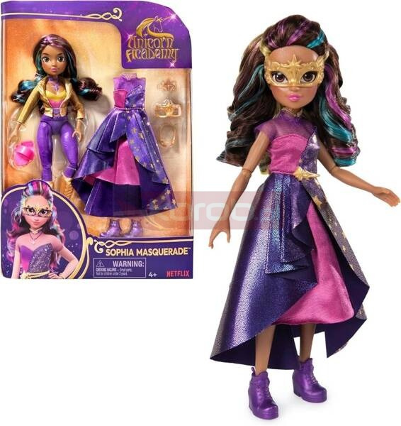 Świętuj magię Wróżek Losu na balu maskowym Akademii Jednorożców z lalką Sophia Masquerade! Zainspirowana serialem animowanym NETFLIX i bestsellerowymi książkami, ta 23 cm lalka z akcesoriami ożywia postać Sophii. Sophia, oddana z dużą dbałością o detale i wyposażona w 9 akcesoriów dla lalek, ma na sobie strój jeździecki i jest gotowa na przygodę ze swoim jednorożcem, interaktywną Gwiazdą (sprzedawanym oddzielnie)! Gdy nadejdzie czas balu, przebierz Sophię, aby zamiast zdejmowanej kurtki, naszyjnika i butów miała na sobie asymetryczną sukienkę w gwiazdki, pasek, maskę i fioletowe botki. Upnij jej rozjaśnione włosy za pomocą narzędzia do włosów i spinki. Dzięki 9 punktom zgięcia możesz pozować Sophię, odtwarzając sceny z serialu! Aby uzyskać więcej sposobów na poznanie Akademii Jednorożców z ulubionymi postaciami, poszukaj lalek Isabel i Avy oraz ich jednorożców, Wirka i Listki (każdy sprzedawany osobno) i rozbuduj świat znany z książek i serialu! Magiczne więzi między uczniami Akademii Jednorożców i ich wierzchowcami pobudzą wyobraźnię do tworzenia niekończących się historii. Zabawki z serii Akademia Jednorożców to wspaniałe prezenty świąteczne lub okolicznościowe dla dzieci, które lubią zabawkowe jednorożce i konie, lalki i akcesoria, domki dla lalek, przedmioty kolekcjonerskie, pluszaki i nie tylko. Zabierz do domu luksusową lalkę Sophia Masquerade z serii Akademia Jednorożców!