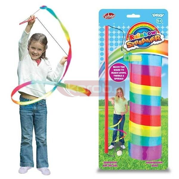 Ogromne pętle, skręty i zwroty można łatwo tworzyć za pomocą tej kolorowej wstążki. Regulowany sznurek na uchwycie pozwala skracać lub wydłużać wirujące ruchy w trakcie lotu, a szumiący dźwięk tworzony przez materiałowy ogon dodaje widowiskowego efektu. To wciągająca rozrywka dla dzieci - zarówno dla tych, które obserwują zabawę, jak i dla tych, które biorą w niej aktywny udział. Wstążka ma ponad 2 metry długości.