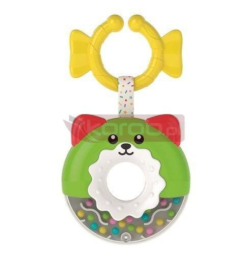 Idealnie wspomaga rozwój dziecka. Kolory, różne faktury powierzchni oraz grzechotka wspierają rozwój multisensoryczny. Specjalne kółko umożliwia wygodne zawieszenie produktu.