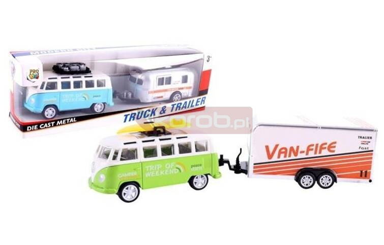 Zawartość zestawu: kamper z metalową karoserią oraz plastikowa przyczepa.