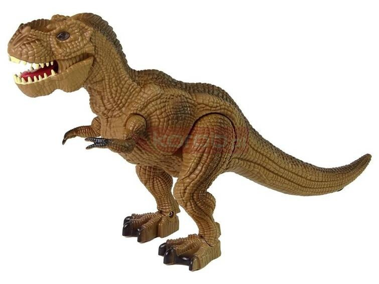 Dinozaur Zdalnie Sterowany Tyranozaur Rex Brązowy Zabawka jest doskonałym odwzorowaniem ogromnego dinozaura, żyjącego około 125 - 100 milionów lat temu. Wykonany jest w kolorze naturalnym zbliżonym do autentycznego umaszczenia wielkich gadów. Chodzący dinozaur może być nie tylko rewelacyjną zabawką przeniesie malucha w świat dinozaurów i Jurajskiego Parku. Rozwinie wyobraźnie malucha oraz pozwoli poznać fakt związane z prehistoria i mitycznymi stworzeniami. Tyranozaur Rex idealnie przypomina prehistorycznego gada, jego pancerz, łuski są odwzorowane z najmniejszym szczegółem. Po włączeniu oczy się rozjaśniają i świecą w kolorze czerwonym. Ruchy wyglądają bardzo realistycznie. Super zaletą jest zdalne sterowanie na podczerwień. Dwa przyciski pomogą poruszać się w przód, rusza głową, paszczą i łapami. W trakcie zabawy wydaje charakterystyczne dźwięki dinozaurów. Produkt nowy, zapakowany w oryginalne opakowanie, pochodzi z ekspozycji.