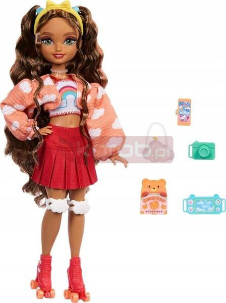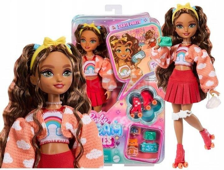 Lalka Barbie Dream Besties Barbie Teresa oznacza, że wszystkie swoje wyjątkowe talenty mogą dzielić się ze światem i wszystko jest możliwe! Lalka Teresa z serii Barbie Dream Besties uwielbia jeździć na wrotkach. Zobacz, jak „śmiga” w swoim modnym stroju uzupełnionym uroczymi akcesoriami! Teresa podąża za swoim marzeniem: chce zostać twórczynią gier wideo! W zestawie ma akcesoria takie jak „konsola do gier”, torebka, ochraniacze na kolana z motywem chmurek, opaska do włosów z kokardką, perełkowy naszyjnik, „aparat”, „komórka” i paczka „misiowych przekąsek”. Teresa podąża za swoim marzeniem: chce zostać twórczynią gier wideo! W zestawie ma akcesoria takie jak „konsola do gier”, torebka, ochraniacze na kolana z motywem chmurek, opaska do włosów z kokardką, perełkowy naszyjnik, „aparat”, „komórka” i paczka „misiowych przekąsek”. Lalka zabawka ma długie, brązowe włosy z pasemkami, częściowo upięte w kitki podkreślające jej uroczą osobowość! Ten zestaw z lalką i akcesoriami to świetny pomysł na prezent dla dzieci w wieku od 4 lat, szczególnie tych, które uwielbiają stylizację i wymyślanie opowieści.