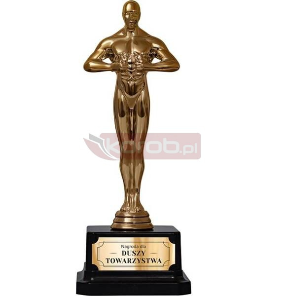 Personalizowana statuetka na prezent z napisem Dusza towarzystwa Odkryj wyjątkowy sposób, aby wyrazić swoje uczucia - z naszym personalizowaną statuetką na prezent z napisem "Dusza towarzystwa ". Idealna dla każdej ważnej i wyjątkowej osoby Twoim życiu, bez względu na okazję. Świetnie sprawdzi się jako upominek na szereg okazji. Wygląd statuetki: Ta elegancka złota statuetka urzeka swoją elegancką, stylową kolorystyką i modnym designem. Złoty odcień, wzbogacony czarnym napisem, nadaje jej wyrafinowany charakter. Unikalny napis nadrukowany na statuetce, dodaje osobistego akcentu. Specyfikacja: Materiał: Tworzywo sztuczne, plastik Kolor postumentu: Czarny Wysokość: 19,5 cm Grawer na laminowanej naklejce umiejscowionej na statuetce wykonywany jest techniką laserową
