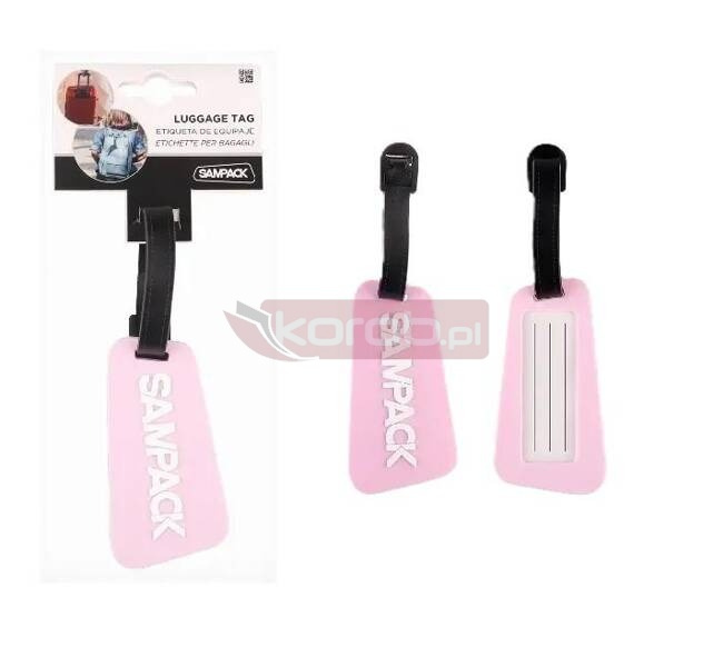 Zawieszka do walizek, plecaków lub innego bagażu z miejscem na wpisanie danych kontaktowych. Wykonana z elastycznego silikonu z tłoczeniem. Z regulowanym paskiem i przezroczystym plastikowym okienkiem z tyłu, które pozwala zobaczyć wpisane dane. Wymiary: 90 x 54 mm. Kolor różowy.