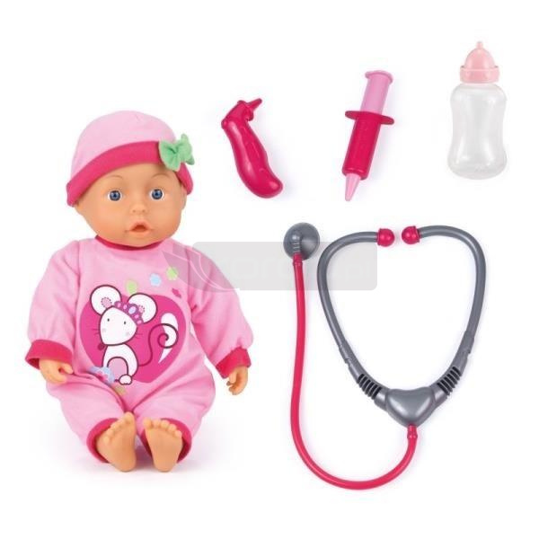 Zestaw lekarza z lalka jest dla wszystkich dzieci, które zawsze chciały bawić się w lekarza. Urocza lalka (33cm) gaworzy, śmieje się lub płacze słodkimi dźwiękami dziecka, gdy naciskasz na jej brzuszek (w sumie: 24 dźwięki dziecka). Ma na sobie uroczy kombinezon z aplikacjami i pasujący kapelusz z kokarda. Jej miękkie ciało sprawia, ze jest idealna do tulenia i przytulania. Zestaw zawiera stetoskop, strzykawkę, termometr do gorączki w uchu i butelkę do wspaniałych zabaw w odgrywanie ról, takich jak słuchanie bicia serca, mierzenie temperatury czy karmienie lalki. Ze względu na poręczny rozmiar lalka jest idealnym towarzyszem podróży.