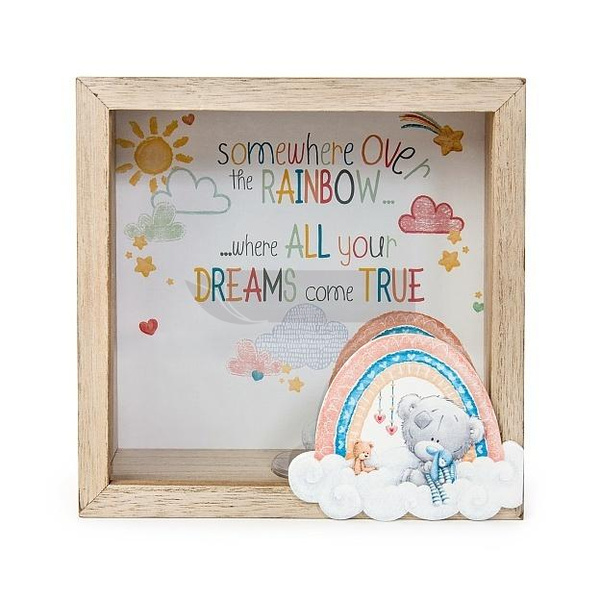 Ta słodka skarbonka ozdobiona jest uroczą, tęczową grafiką przedstawiającą małego misia Tatty Teddy'ego tulącego się do pluszowego króliczka. Naturalne drewno w połączeniu z konstrukcją przypominającą ramę sprawia, że ??jest to wyjątkowy prezent, który będzie wyglądał stylowo w każdym pokoju dziecięcym. Skarbonka ma kształt ramki z otworem na pieniądze u góry i jest ozdobiona napisem somewhere over the rainbow... where all your dreams come true. Dzięki neutralnej, tęczowej grafice ta śliczna skarbonka doskonale sprawdzi się jako prezent dla wyjątkowego dziecka niezależnie od tego, czy jest to chłopiec, czy dziewczynka. Wymiary: 19 cmx19cm.