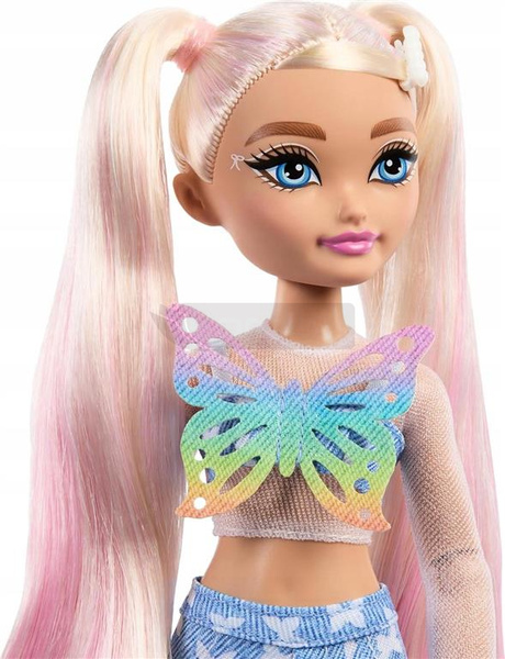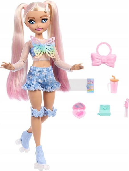 Lalka Barbie „Malibu” z serii Barbie Dream Besties uwielbia jeździć na wrotkach. Zobacz, jak „śmiga” w swoim modnym stroju uzupełnionym uroczymi akcesoriami! Barbie „Malibu” marzy o własnej firmie kosmetycznej. W zestawie ma akcesoria tematyczne, w tym „błyszczyk”, serduszkowe lusterko, torebkę, ochraniacze na kolana z motywem motylków, „aparat”, „napój” i „komórkę”. Lalka do ustawiania w różnych pozach ma na sobie zdejmowane ubranka, w tym motylkowy top na białej półprzezroczystej bluzce z długim rękawem, dżinsowe szorty z motywem motylków i falbanką oraz niebieskie wrotki. Lalka Barbie „Malibu” ma długie blond włosy uczesane w dwie kitki i ozdobione perełkową spinką, z różowymi pasmami z efektem ombre, które podkreślają jej energiczną osobowość! Ten zestaw z lalką i akcesoriami to świetny pomysł na prezent dla dzieci w wieku od 4 lat, szczególnie tych, które uwielbiają stylizację i wymyślanie opowieści.