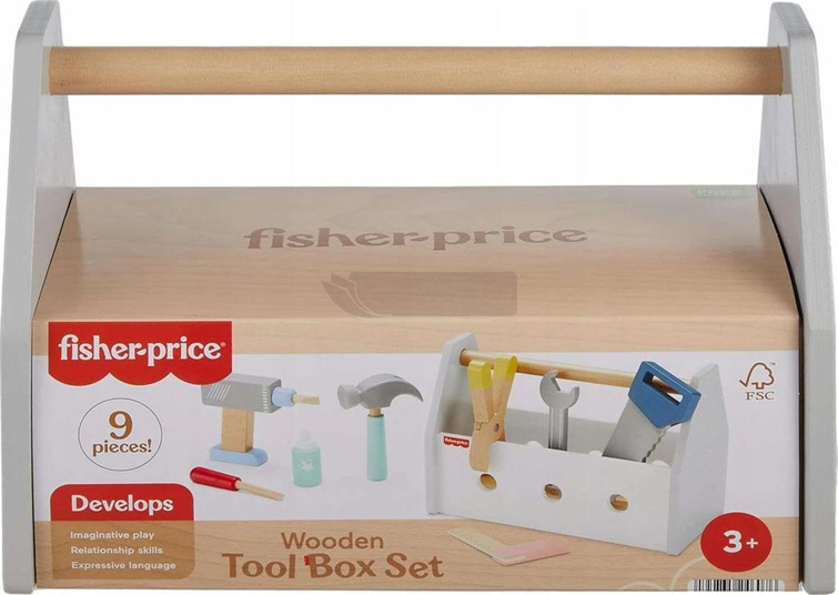 Z tym zestawem drewnianych zabawek Mały majsterkowicz od Fisher-Price® przedszkolaki mogą bawić się z wyobraźnią: „naprawiać” i „budować”, co tylko zechcą! 9-elementowy zestaw zawiera wszystko, co potrzebne małej złotej rączce, w tym „wiertarkę”, „młotek”, „śrubokręt”, „klucz”, „piłę”, „kombinerki”, „miarkę” i „butelkę kleju” oraz skrzyneczkę do ich przechowywania. Wykonany z drewna pochodzącego z prawidłowo zarządzanych lasów z certyfikatem FSC® zestaw zachęca małych budowniczych do zabawy z wyobraźnią