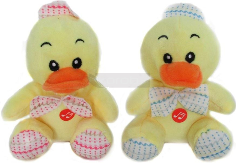 Maskotka kaczuszka z kokardą - pluszak na wyjątkowe okazje. Wielkość: 14cm. Zabawka posiada przycisk dźwiękowy - wydaje głos po naciśnięciu. Cena dotyczy 1 sztuki.